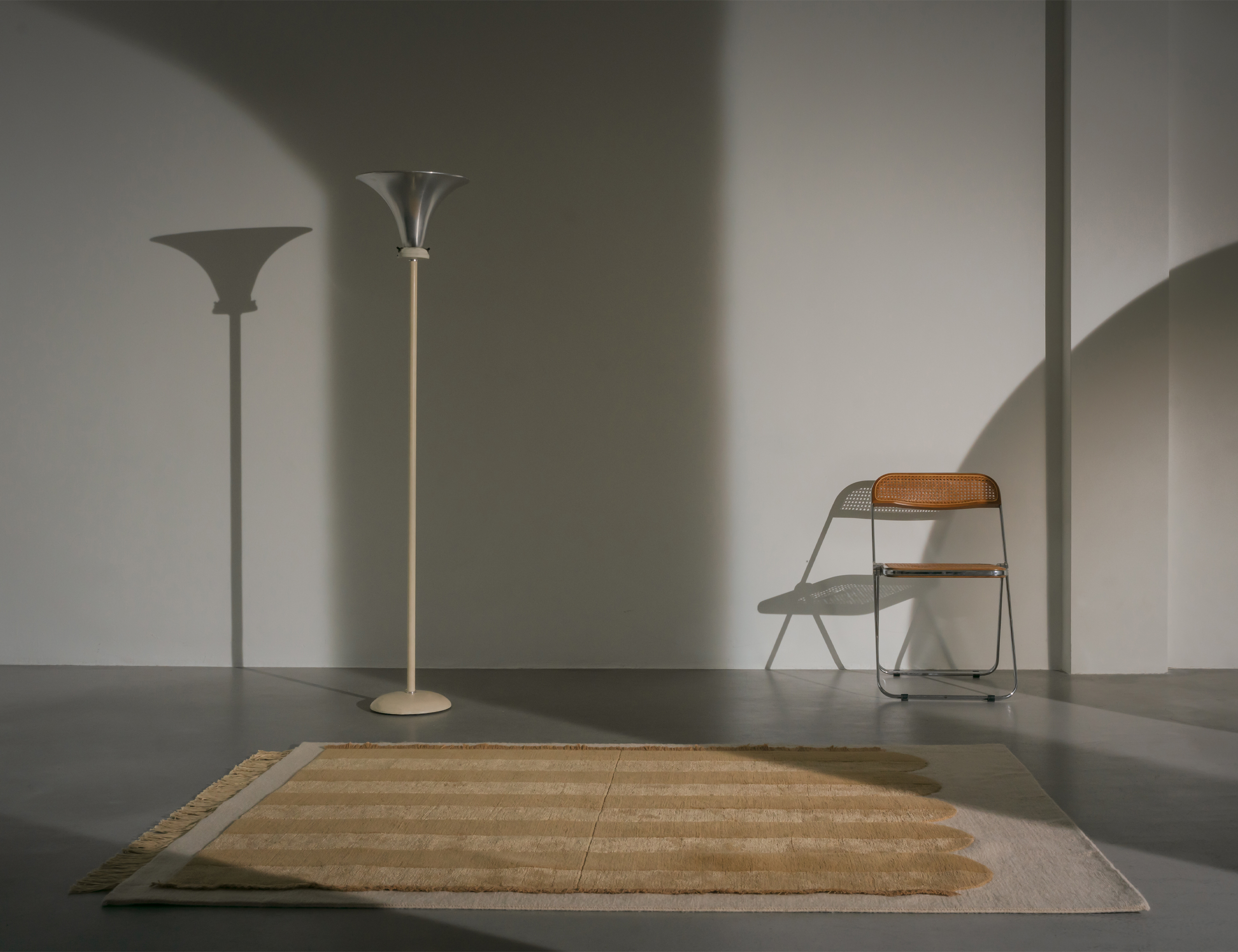 Volta is a hand-knotted rug that embodies a timeless aesthetic language, inspired by visual memories and chromatic harmonies of Mediterranean lands.It translates architectural shapes into a simple rhythmic layout and a strong tactile finish. Golden arches draw a soft change of glow, creating depth juxtaposing different types of fibers. Soft yarns and rough surfaces are carefully combined to create a multilayered effect, using traditional Tibetan knot techniques. The high pile arches laying on top of a flat base gives the impression that one carpet rests on top of another. The richness in structures and materials describes the virtuosic of technical artisanal knowledge and aims to elevate tactility.